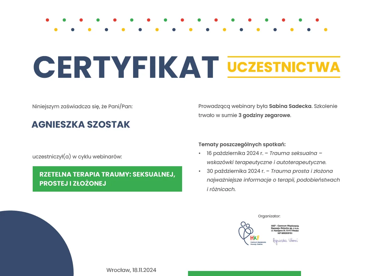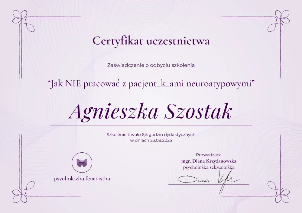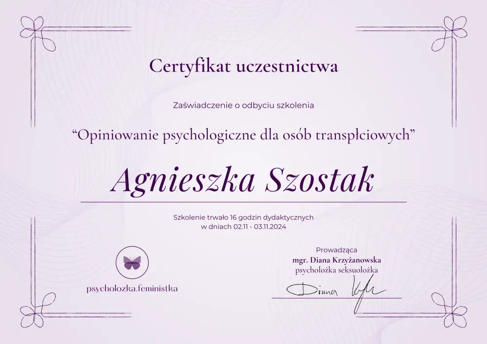 Jestem psycholożką i diagnostką psychologiczną. Ukończyłam studia psychologiczne na Uniwersytecie im. Adama Mickiewicza w Poznaniu, ze specjalizacją z seksuologii klinicznej oraz psychoterapii zaburzeń psychicznych. W trakcie studiów zdobyłam wiedzę i doświadczenie z zakresu diagnozy psychologicznej oraz pracy z osobami mierzącymi się z trudnościami związanymi z tożsamością płciową i orientacją seksualną.