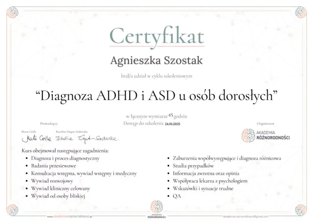 W swojej pracy czerpię z podejścia poznawczo-behawioralnego (CBT), terapii Akceptacji i Zaangażowania (ACT) oraz technik psychoedukacyjnych. Często wspieram osoby po diagnozie ADHD lub spektrum autyzmu, które uczą się lepiej rozumieć swoje trudności oraz funkcjonować w zgodzie ze swoim nieneurotypowym mózgiem. Zajmuję się również diagnozą ADHD i spektrum autyzmu u osób dorosłych.